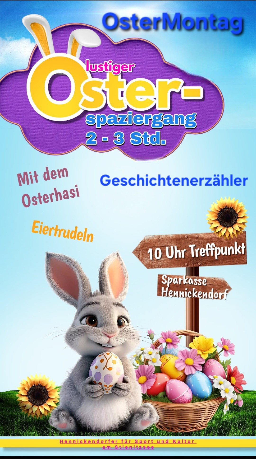 The HFSKS e.V. is going on its annual Easter walk and YOU are cordially invited. We will walk around the Lange-Damm meadows for about 2-3 hours, have fun tossing eggs and the Easter bunny will be there as always. You can also listen to the stories told by the storyteller. Pack your little picnic parcel and meet us at 10 am at the Sparkasse Hennickendorf. We look forward to seeing you there.