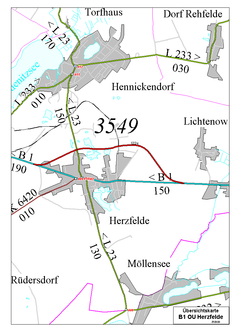 Aufgrund vielfacher Nachfrage veröffentlichen wir hiermit den zukünftigen Straßenverlauf der B1-Umgehungsstraße Herzfelde. Die vom Landesverband zur Verfügung gestellte Karte finden Sie im Anhang.
