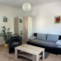- Wohnbereich mit Klimaanlage, TV, WLAN-Zugang, Schlafcouch für 2 Personen, Couchtisch, Sessel, Kleiderschrank