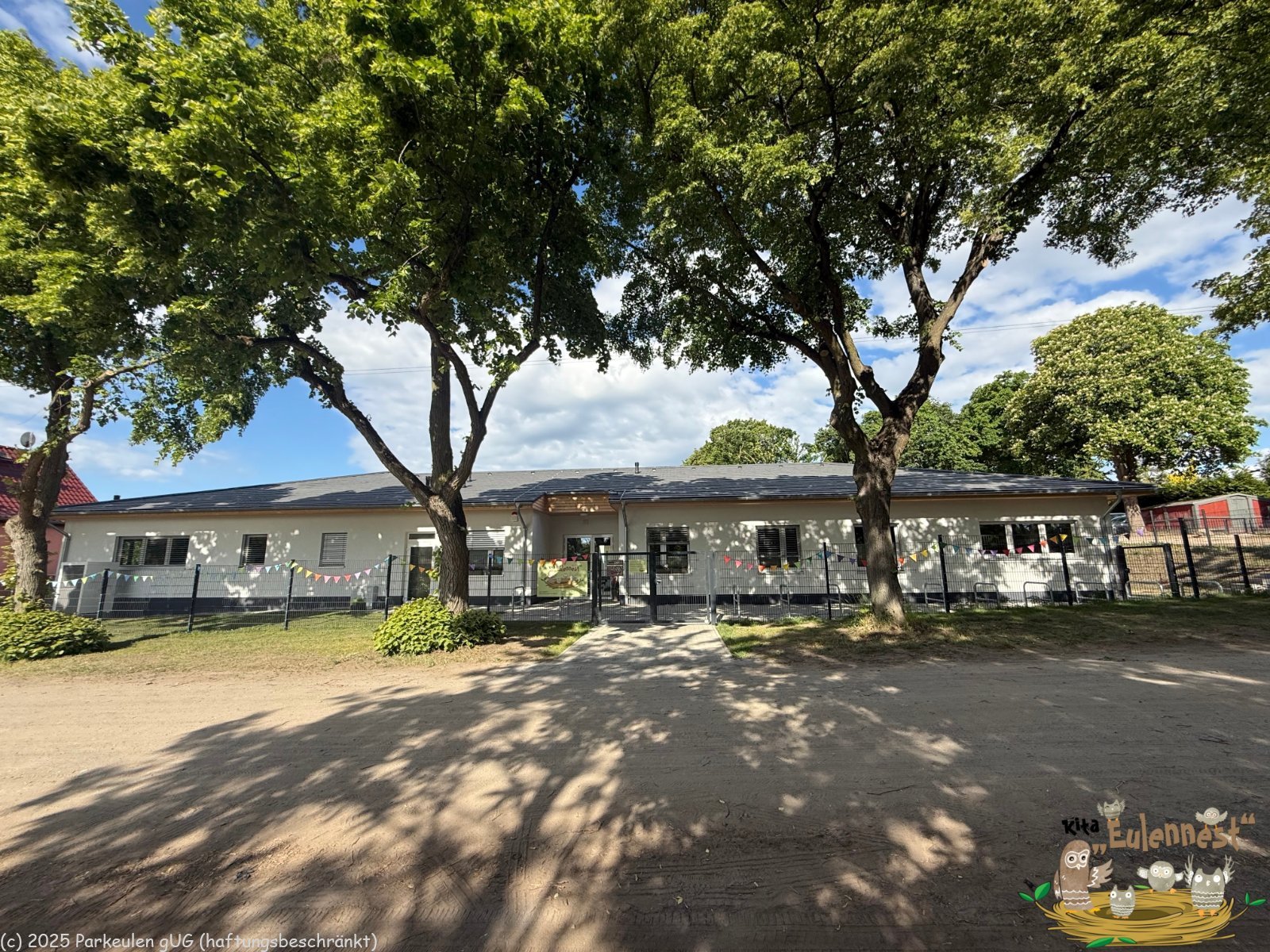 La crèche est un bâtiment récemment construit dans la commune de Rüdersdorf. Il est entouré de prairies, de jardins, de champs et de maisons individuelles.