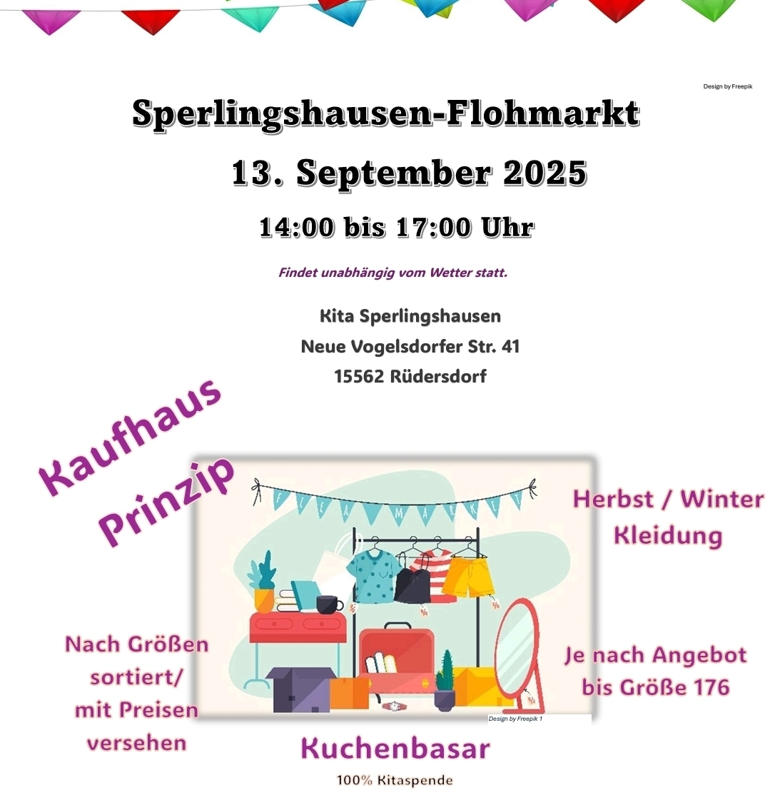Die Kita Sperlingshausen veranstaltet einen Flohmarkt nach Kaufhausprinzip für Baby-/Kinderkleidung bis Gr. 176 (je nach Verfügbarkeit), Spielzeuge etc. Das Kaufhausprinzip meint, dass jedes angebotene Teil mit einem Preis und der Größe ausgezeichnet ist. Die Waren werden am Tag des Flohmarktes nach Größen/Themen geordnet, es wird keine einzelnen Verkaufsstände geben. Bezahlt werden die Waren beim Verlassen des Flohmarktes an der „Kasse“. Sie können sich so gezielt umsehen, in Ruhe stöbern und am Ende ihre Waren bezahlen.