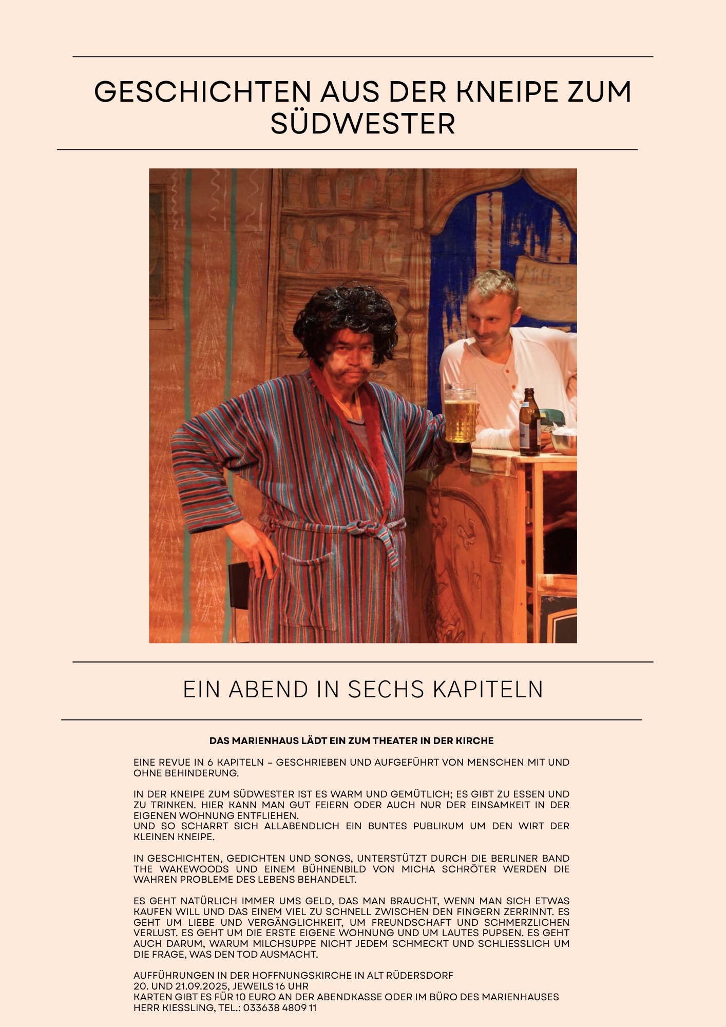 Prawdziwe problemy życia są poruszane w opowieściach, wierszach i piosenkach, wspieranych przez berliński zespół "The Wakewoods" i scenografię Micha Schrötera.