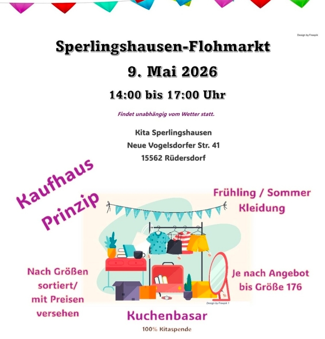 In der Kita Sperlingshausen wird einen Flohmarkt im Kaufhausprinzip für Baby-/Kinderkleidung bis Gr. 176 (je nach Verfügbarkeit), Spielzeuge etc. veranstaltet. Das Kaufhausprinzip meint, dass jedes angebotene Teil mit einem Preis und der Größe ausgezeichnet ist. Die Waren werden am Tag des Flohmarktes nach Größen/Themen geordnet, es wird keine einzelnen Verkaufsstände geben. Bezahlt werden die Waren beim Verlassen des Flohmarktes an der „Kasse“. Die Käuferinnen und Käufer können sich so gezielt umsehen, in Ruhe stöbern und am Ende ihre Waren bezahlen.