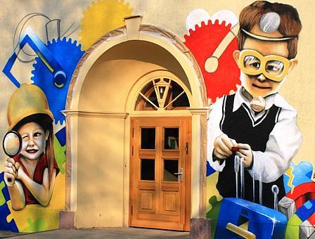 Centrum opieki dziennej "Kleine Forschergeister" zostało otwarte 1 kwietnia 2013 r. po gruntownej renowacji budynku dawnej szkoły w Alt-Rüdersdorf. Podwórko szkolne zostało przekształcone w plac zabaw dostosowany do wieku dzieci. Przystanek autobusowy "Grundschule" na trasie 950 znajduje się bezpośrednio przed budynkiem, a kościół Hoffnungskirche znajduje się w bezpośrednim sąsiedztwie.