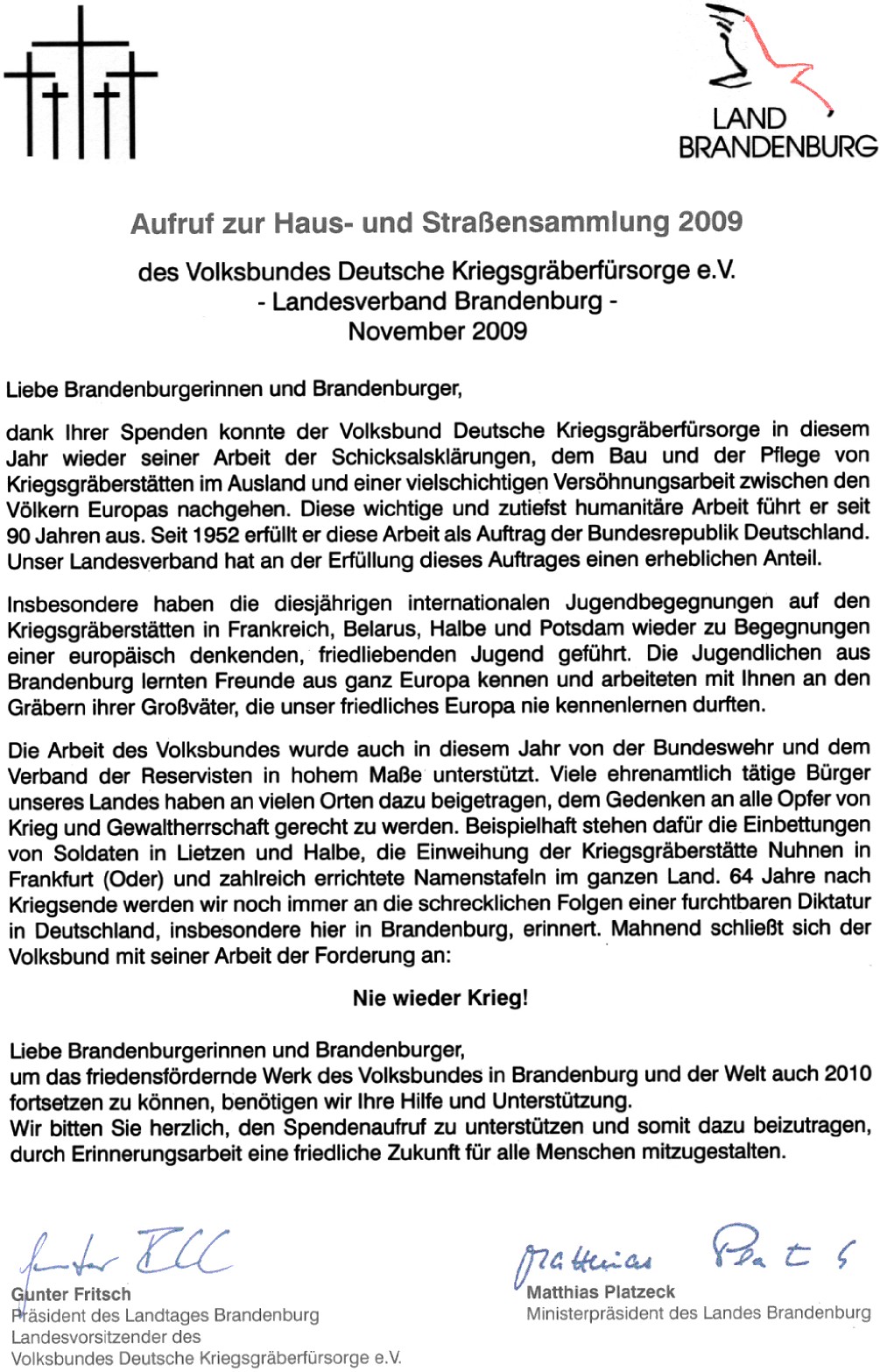 Der Volksbund Deutsche Kriegsgräberfürsorge e. V. - Landesverband Brandenburg - führt im November 2009 eine Haus- und Straßensammlung durch.