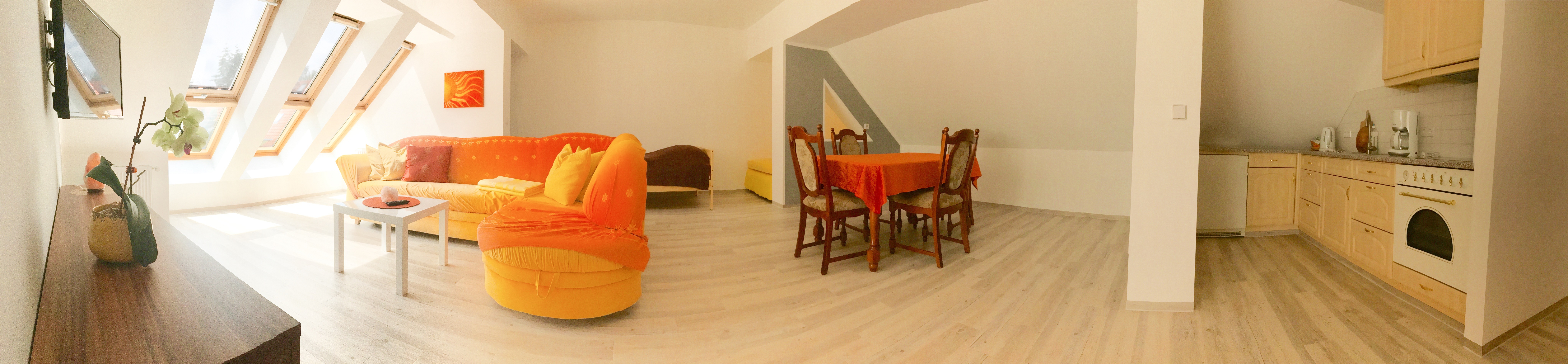 Wohn- und Essbereich mit integrierter Küchenzeile und 3 Schlafmöglichkeiten (Schlafcouch und 2 einzelne Schlafnischen),