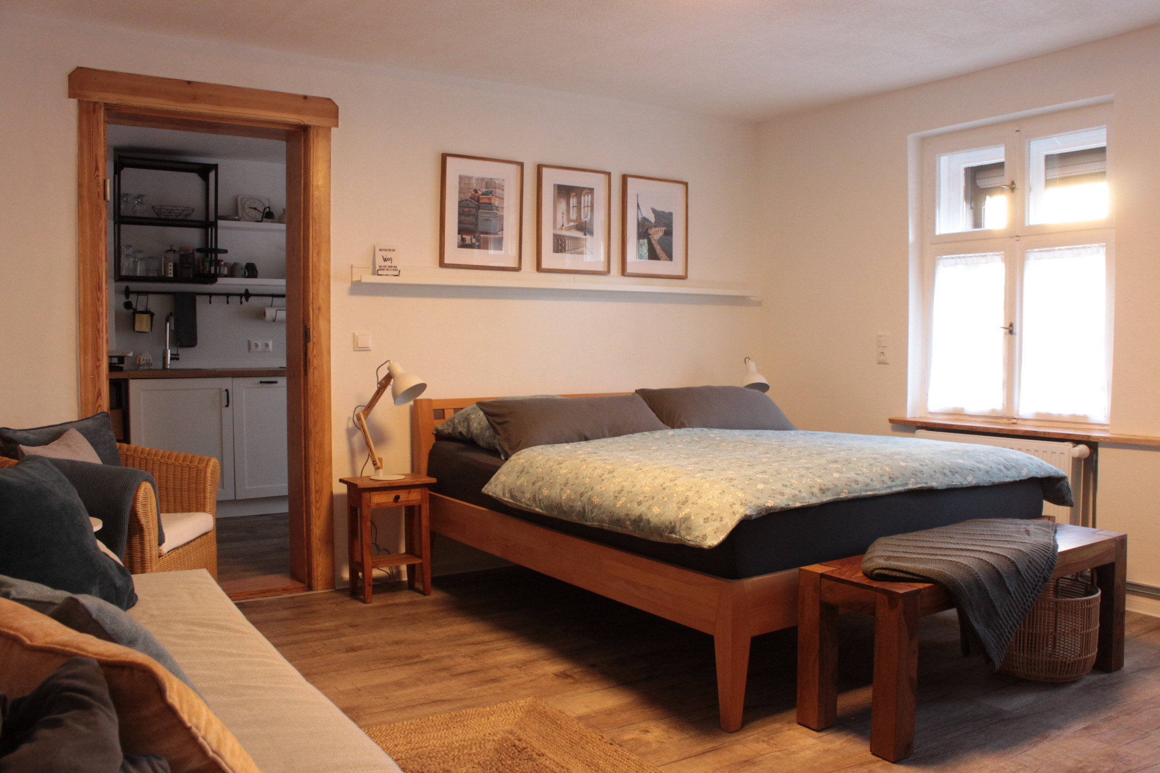 Unsere „Kleine Bleibe“ 41m², verfügt über einen separaten, ebenerdigen Eingangsbereich (1 Stufe), Flur, kombinierten Wohn- und Schlafraum, mit Doppelbett, Schlafcouch (Aufbettung für 2 weitere Personen/ Kinder möglich), TV und WLAN, eine voll ausgestattete, gemütliche Wohnküche und ein Duschbad. Alle Räume sind mit viel Liebe zum Detail eingerichtet. Altes trifft auf Neues und auf ein individuelles und jahreszeitliches Ambiente - ein Ort zum Ankommen & Wohlfühlen!